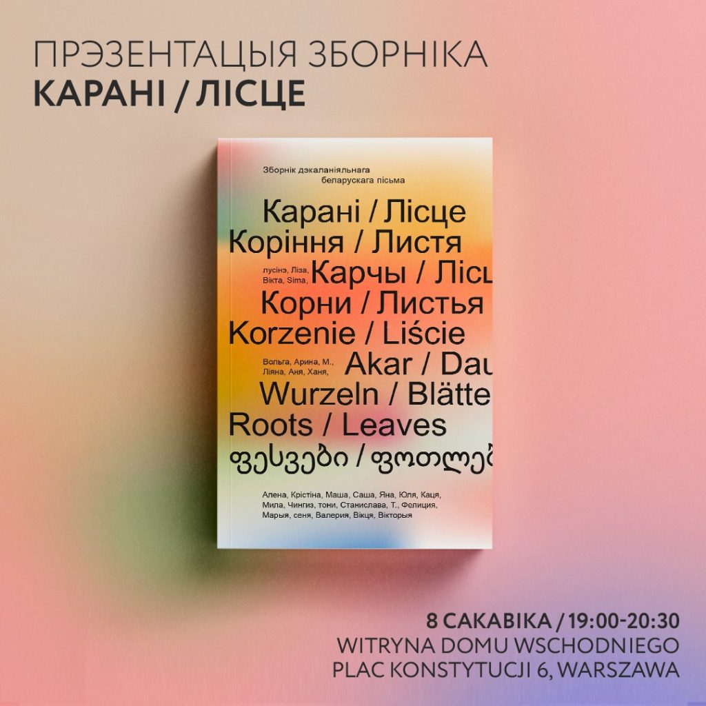 8 САКАВІКА ў Варшаве адбудзецца прэзентацыя кнігі “Карані / лісце”, якая ўяўляе сабой зборнік дэкаланіяльных тэкстаў, напісаных жанчынамі, транс і небінарнымі людзьмі з Беларусі. Кніга паўстала ў выніку пісьменніцкай лабараторыі, праца якой цягнулася апошнія паўгода і аб’яднала 50 літаратара:к, што цяпер жывуць у розных краінах. Арганізатары падкрэсліваюць, што ім важна зрабіць сустрэчу пляцоўкай супольнага абмеркавання, і заахвочваюць кожн:ую далучыцца да яго ў камфортнай форме.