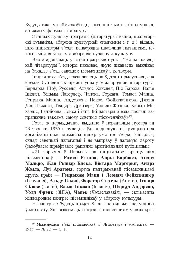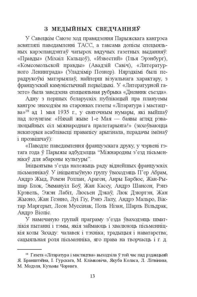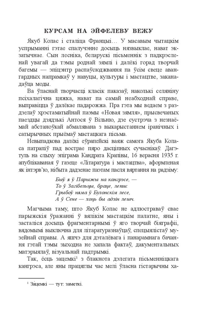 Як гаворыцца ў анатацыі, у кнізе чытачы знойдуць архіўную рэканструкцыю акалічнасцяў удзелу Якуба Коласа ў вышэйназваным літаратурным кангрэсе (Парыж, 1935). Мікола Трус публікуе даклад нашага класіка, які быў перакладзены на расейскую, французскую і немецкую мовы, а таксама шэраг унікальных матэрыялаў, што дазваляюць па-новаму прачытваць два нарысы пісьменніка пра паездку ў сталіцу Францыі і больш панарамна разглядзець адметную падзею ў культурным жыцці Еўропы і ўсяго свету.