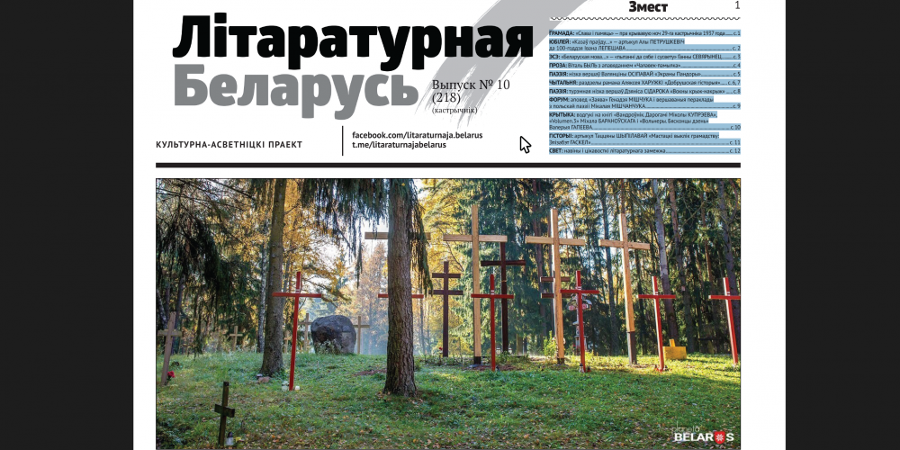 Выйшаў кастрычніцкі нумар “Літаратурнай Беларусі”, тэмай якога стала памяць пра крывавую ноч з 29 на 30 кастрычніка 1937 году. Таксама чытачы знойдуць у выпуску традыцыйныя рубрыкі: “Чытальня”, “Паэзія”, “Крытыка” і г.д.
