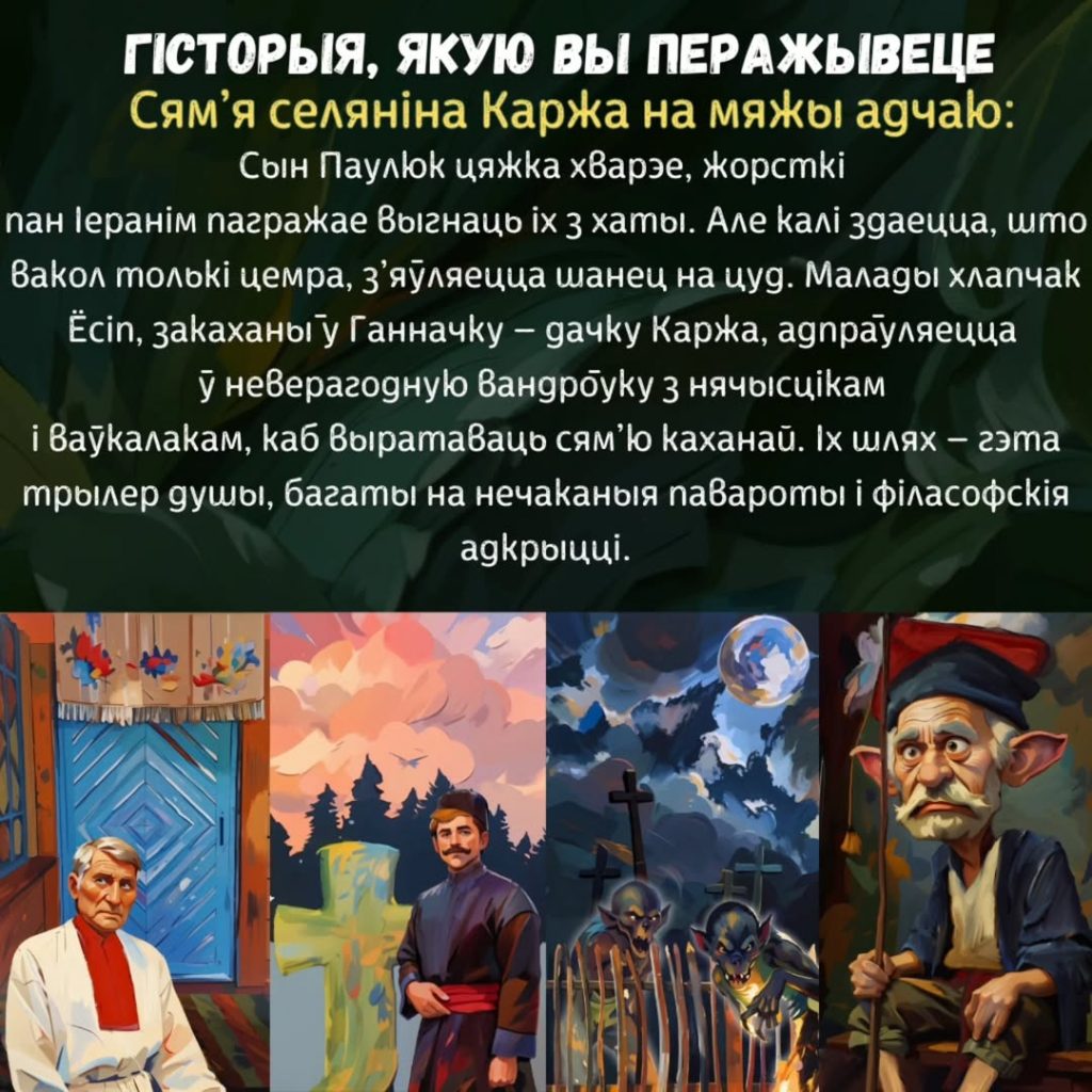 “Гісторыя разгортваецца на Палессі, дзесьці паміж Туравам і Лельчыцамі, акурат перад Калядамі, вакол сям’і селяніна Каржа, чый сын Паўлюк цяжка хварэе. Сям’я апынулася ў няпростай сітуацыі: усе пажыткі вытрачаны на лекаванне сына, пазыкі перад жорсткім панам Іеранімам толькі растуць, і той пагражае выгнаць іх з хаты. Маладая сястра хлопчыка, Ганначка, вымушана цягнуць гора сям’і на сваіх маладых плячах, а Ёсіп, які кахае Ганначку (разам з містычнымі істотамі), спрабуе выратаваць Коржаву сям’ю.