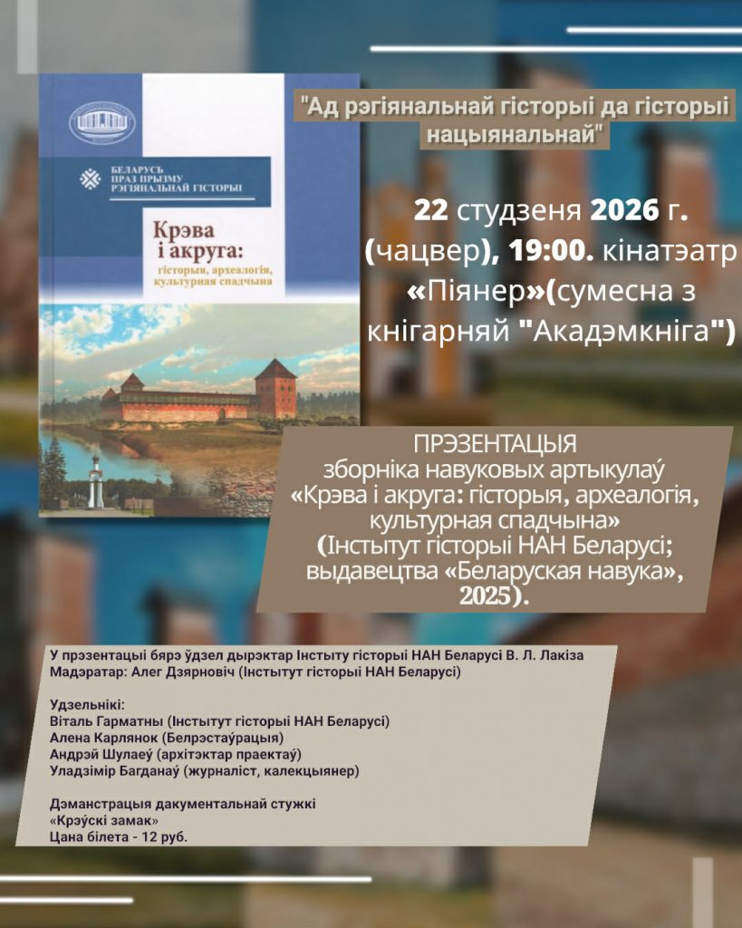 У межах кіналекторыю “Кіно і кніга” кнігарня “Акадэмкніга” запрашае на прэзентацыю зборніка навуковых артыкулаў “Крэва і акруга: гісторыя, археалогія, культурная спадчына” з удзелам дырэктара Інстытуту гісторыі НАН Беларусі Вадзіма Лакізы. Сустрэчу, якая пройдзе 22 студзеня а 19 гадзіне ў кінатэатры “Піянер”, будзе мадэраваць гісторык Алег Дзярновіч.