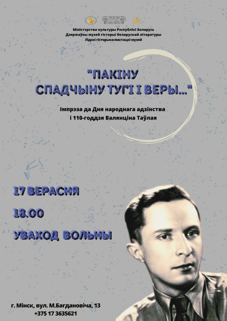 17 верасня ў Дзяржаўным музеі гісторыі беларускай літаратуры пройдзе імпрэза прысвечаная 110-годдзю з дня нараджэння заходнебеларускага паэта Валянціна Таўлая пад назвай “Пакіну спадчыну тугі і веры…”
