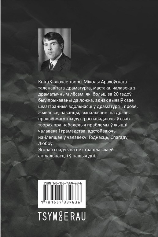 Мікола Арахоўскі нарадзіўся ў Сяльцы Бярозаўскага раёна, скончыў менскую мастацкую вучэльню Глебава і Беларускі дзяржаўны тэатральна-мастацкі інстытут, працаваў мастаком афарміцелем. У літаратуры сцвердзіўся як драматург, пісаў таксама вершы, апавяданні, казкі, публіцыстычныя артыкулы. У 1977 годзе атрымаў цяжкую траўму і рэшту жыцця правеў прыкутым да ложка. Значная частка твораў захоўвалася толькі ў рукапісах. Кніга сабрала значную частку спадчыны пісьменніка і стане новым адкрыццём імя для сучаснага чытача, піша Суполка беларускіх пісьменнікаў.