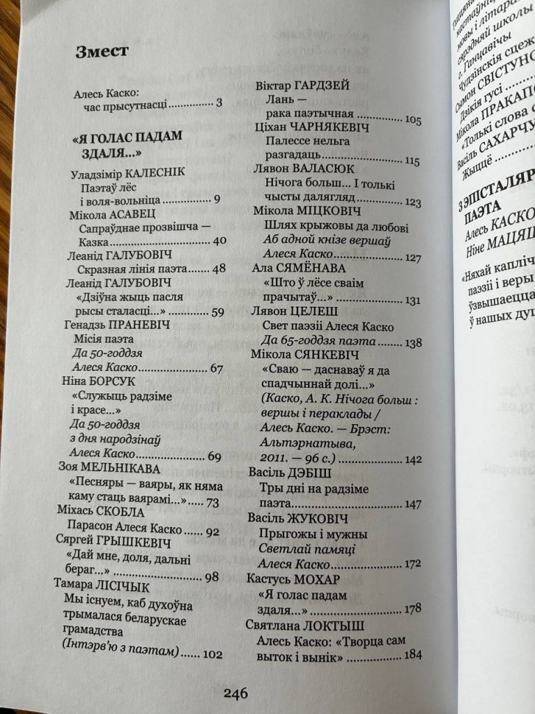 У кнігу ўвайшлі артыкулы, эсэ, успаміны, гутаркі і згадкі пра знакавага паэта Алеся Каско (1951—2017), а таксама ягоныя выбраныя вершы і лісты. Асабліва цікавымі для чытача могуць быць лісты Алеся Каско да паэткі і перакладчыцы Ніны Мацяш.