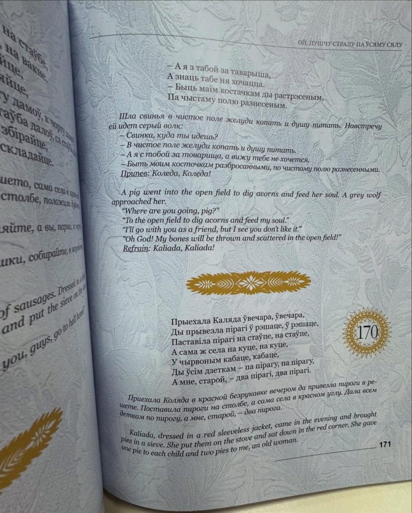 У кнізе змешчаны беларускія каляндарныя песні з пераказам на расейскую і ангельскую мовы. Выданне шыкоўна ілюстраванае выцінанкамі ад Наталлі Бярнадскай і Вольгі Налівайкі, фотаздымкамі Паўла Ганчара, а таксама мае гукавы дадатак (старонкі маюць кюар-коды). На адмысловым YouTube-канале можна паслухаць аўдыязапісы, тэксты якіх змешчаны ў зборніку.