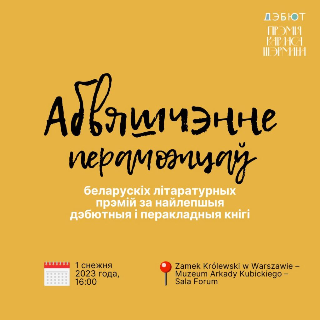 Падчас Кірмашу гістарычнай кнігі ў Варшаве 1 снежня адбудзецца абвяшчэнне лаўрэатаў і лаўрэатак дзвюх беларускіх літаратурных прэмій: “Дэбют” за найлепшую дэбютную кнігу і Прэміі Карласа Шэрмана за найлепшы мастацкі пераклад на беларускую мову.