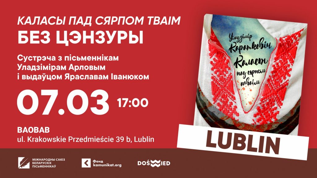 У суботу, 7 сакавіка, у Любліне адбудзецца прэзентацыя новага выдання кнігі “Каласы пад сярпом тваім” аўтарства класіка беларускай літаратуры Уладзіміра Караткевіча. Удзел бяруць выдавец, дырэктар Фонда “Камунікат” Яраслаў Іванюк і пісьменнік, папулярызатар гісторыі Уладзімір Арлоў.