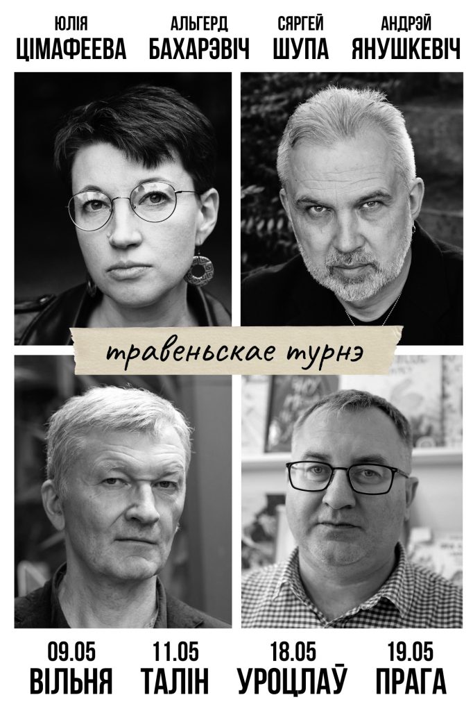 Паэтка Юля Цімафеева, пісьменнік Альгерд Бахарэвіч, перакладчык Сяргей Шупа і выдавец Андрэй Янушкевіч супольна наведаюць чатыры вялікія гарады, каб сустрэцца са сваімі чытачамі.