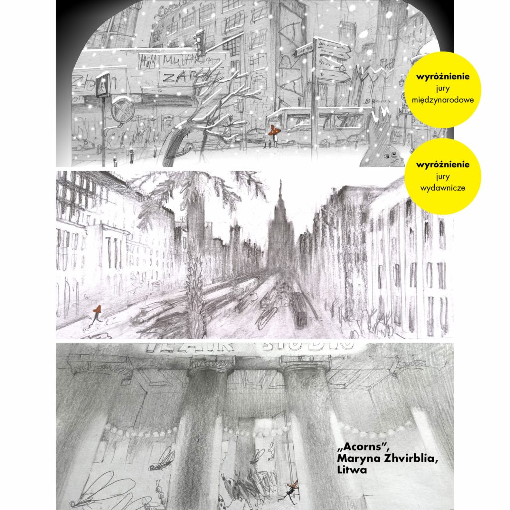 Праект кнігі “Acorns“ (Жалуды) Марыны Жвірблі (падавалася з Літвы) — гэтая вялікая графічная кніга без слоў, якая апавядае пра Мухамор, які вымушаны шукаць новае месца для жыцця на зямлі. Калі дуб, пры якім ён расце, раптоўна ссякаюць, герой у роспачы адпраўляецца ў невядомасць. Пасля доўгага падарожжа ён прыязджае ў Варшаву, дзе змагаецца з адзінотай і пачуццём непрыстасаванасці. Але нарэшце, праз доўгі час, ён зноў пачынае бачыць светлы бок жыцця.