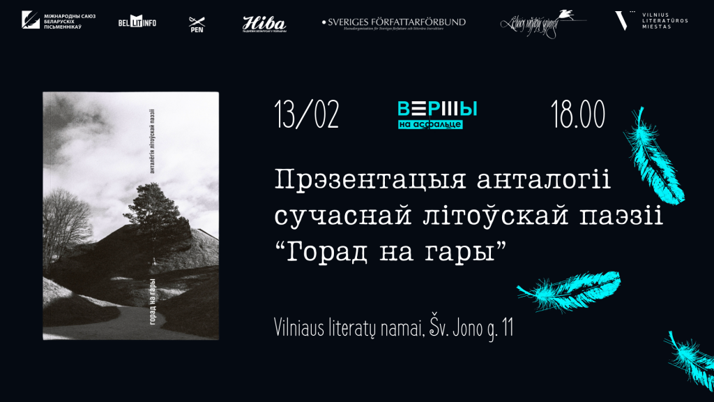 13 лютага ў супрацы з Vilnius UNESCO literatūros miestas адбудуцца чытанні літоўскіх паэтаў і паэтак іх беларускіх перакладчыкаў, прымеркаваныя да выхаду новай вялікай анталогіі сучаснай літоўскай паэзіі “Горад на гары”. Кніга прадстаўляе 29 галасоў найноўшай літоўскай лірыкі, многія з аўтараў перакладзеныя на беларускую мову ўпершыню. (Vilniaus literatų namai, пачатак Šv. Jono g. 11. 18-00).
