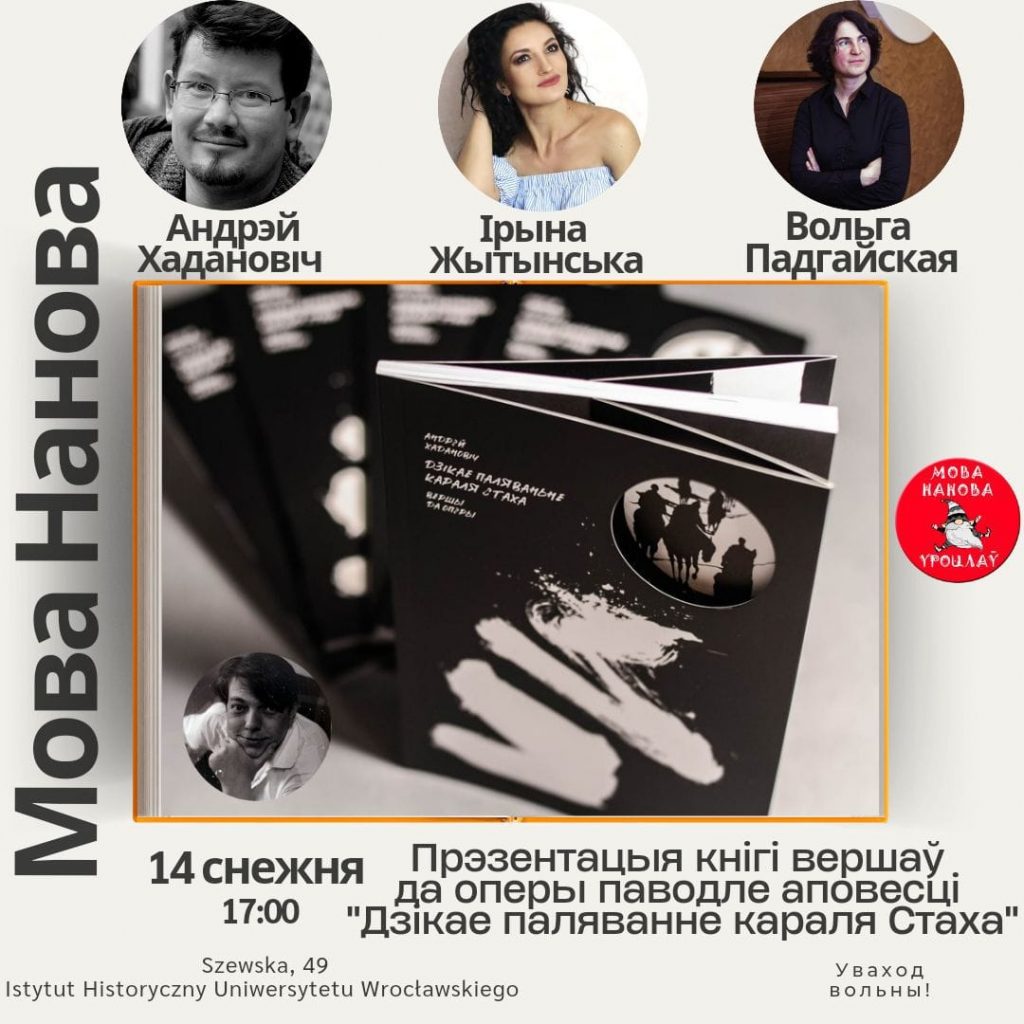 14 СНЕЖНЯ адбудзецца прэзентацыя кнігі вершаў Андрэя Хадановіча да оперы “Дзікае паляванне караля Стаха” ва Уроцлаве ў межах курсаў “Мова Нанова”.