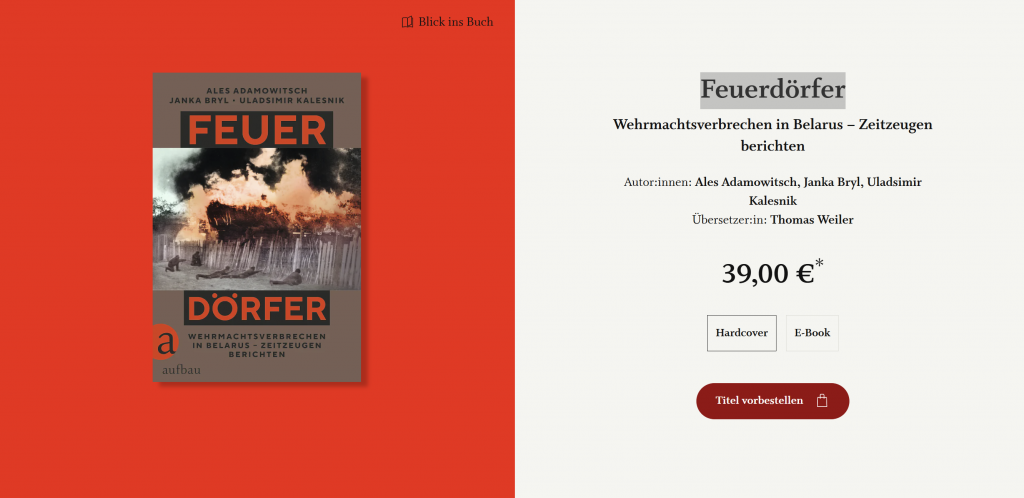 Нямецкі пераклад кнігі мае назву “Feuerdörfer” (Вогненныя вёскі) і выйшаў з друку ў выдавецтве Aufbau. Кніга можна набыць праз сайт выдавецтва ў дзвюх верскіях: папяровай у цвёрдай вокладцы і электроннай. Навіной падзяліўся ў фэйсбуку журналіст, пісьменнік, даследчык беларускай музыкі і культуры Інга Петц (Ingo Petz).