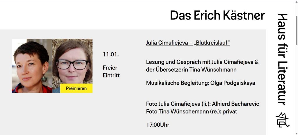 11 студзеня у 17:00 у Літаратурным доме Эрыха Кестнера ў Дрэздэне пройдзе прэзентацыя навінкі з удзелам Юлі Цімафеевай, перакладчыцы Ціны Вюншман і кампазітаркі Вольгі Падгайскай, якая напісала адмысловае музычнае суправаджэнне для чытання кнігі “Кровазварот”.