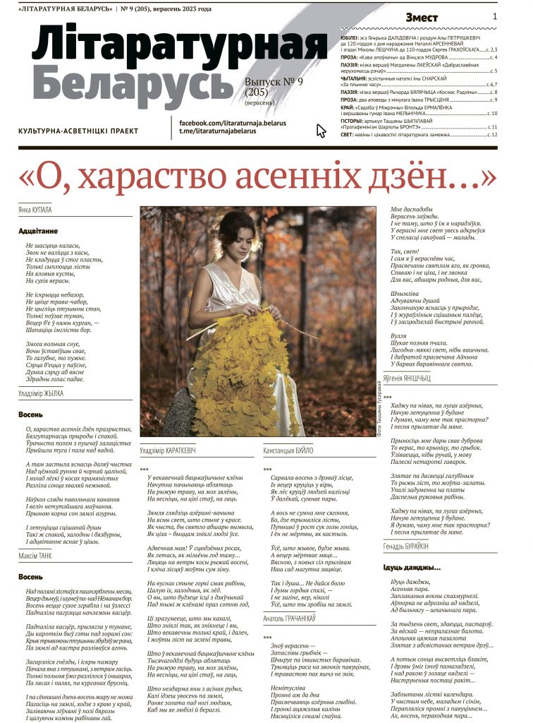 Выйшаў вераснёўскі нумар штомесячніка “Літаратурная Беларусь”. Як і зазвычай, выданне друкуе навіны літаратурнага жыцця, эсэ і ўспаміны, новыя вершы і новую беларускую прозу.