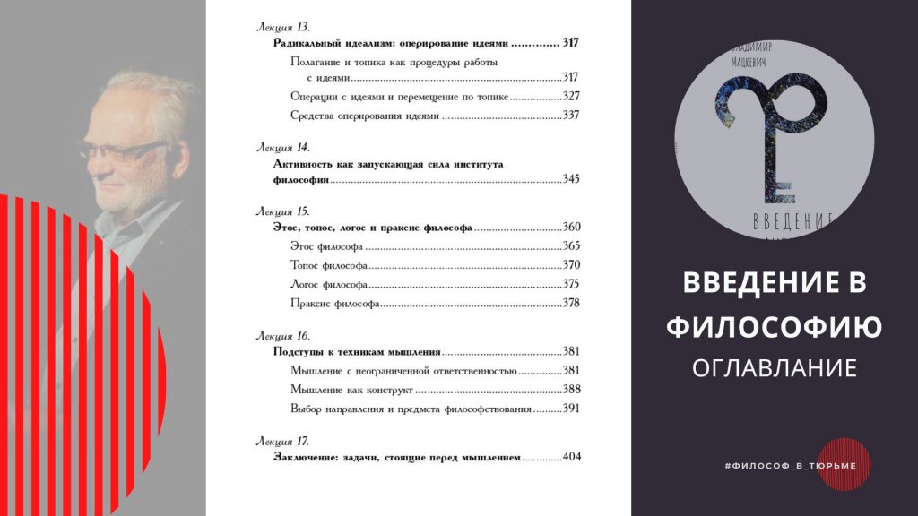 Кніга “Уводзіны ў філасофію” (Введение в философию) Уладзіміра Мацкевіча – гэта філасофская размова ад першай асобы пра мысленне, індывідуальнасць, ідэі і філасофіі. Кніга пабудаваная на аснове цыклу лекцы, прачытаных у 2008–2009 гадах.