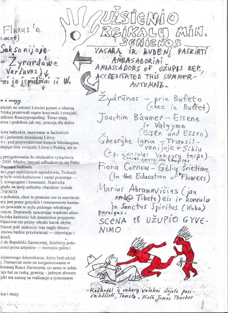 — “Зарачанскі Зьвястун” пачаў выдаваць літаратар і перакладчык Томас Чапайціс, адзін з суаўтараў канстытуцыі Зарачанскай Рэспублікі*, ён дакладна наватар для Вільні, кніжны чалавек. Гэта было яшчэ да таго, як з’явілася і Зарачанская Рэспубліка, і канстытуцыя, я думаю, гэта год дзесьці 1997-ы. Я тады пазнаеміўся з Томасам, мы першы нумар рабілі разам. Праўда, сам нумар я не знайшоў, але ён дзесьці існуе.