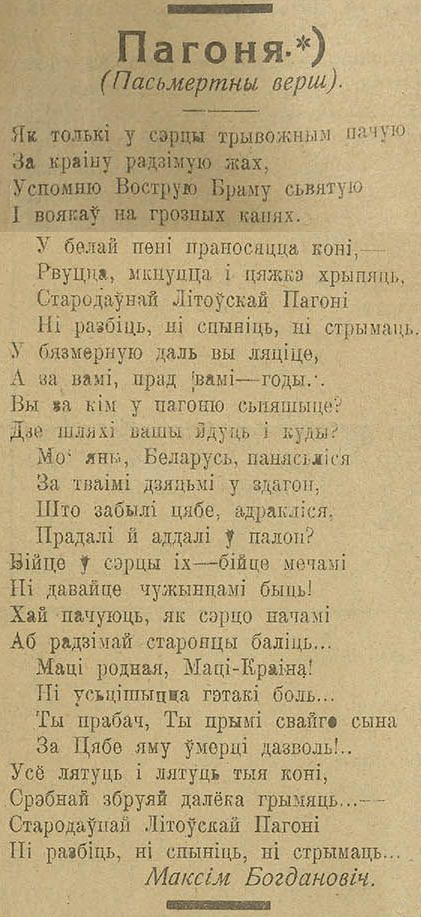 То бок, і нацыянальны эпас, і багемная паэзія беларусаў пачыналіся тут, у Вільні, і пра Вільню. У 1911 годзе тут зьяўляецца Максім Багдановіч і піша свае віленскія вершы, якія стануць пачаткам урбаністычнай або гарадзкой беларускай паэзіі.