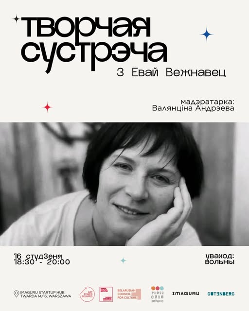 16 студзеня ў Варшаве на сустрэчы з Евай Вежнавец можна будзе задаць пытанні, падпісаць кнігі, паслухаць развагі аўтаркі. Мадэратарка сустрэчы — галоўная рэдактарка выдавецтва Gutenberg Publisher Валянціна Андрэева.