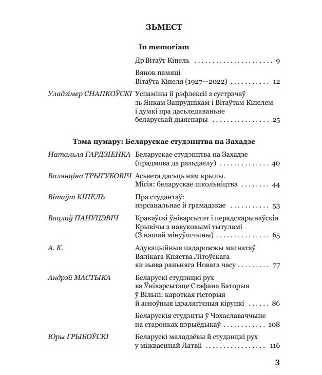 Альманах пачынаецца рубрыкай In memoriam, дзе зьмешчаныя кароткая біяграфія нядаўна памерлага старшыні Беларускага Інстытуту Навукі й Мастацтва др Вітаўта Кіпеля (1927—2022), успаміны-згадкі ўнука, сябраў і знаёмых пра памерлага, а таксама тэкст Уладзімера Снапкоўскага “Успаміны й рэфлексіі з сустрэчаў зь Янкам Запруднікам і Вітаўтам Кіпелем і думкі пра дасьледаваньне беларускай дыяспары”.