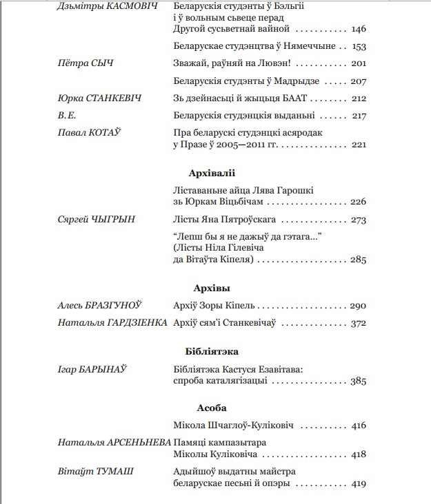 У традыцыйнай рубрыцы “Архіваліі” гэтым разам зьмешчана ліставаньне сьвятара айца Льва Гарошкі й пісьменьніка й ведамага беларускага інтэлектуала на эміграцыі Юркі Віцьбіча з 1948—1954 гг., арыгіналы якіх захоўваюцца ў Беларускай бібліятэцыі імя Ф. Скарыны ў Лёндане (Вялікабрытанія); зробленая Сяргеем Чыгрыным публікацыя лістоў да яго беларускага пастара Яна Пятроўскага, а таксама пададзеныя два лісты Народнага паэта Беларусі Ніла Гілевіча да старшыні БІНіМу др Вітаўта Кіпеля з 1990-х гг. у матэрыяле пад назовам “Лепш бы я не дажыў да гэтага…”.