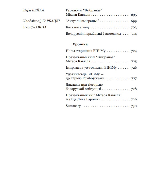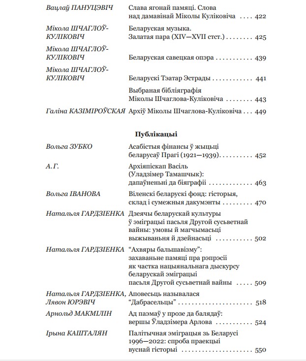 У таксама традыцыйным разьдзеле “Публікацыі” гэтым разам месьцяцца працы: Вольгі Зубко “Асабістыя фінансы ў жыцьці беларусаў Прагі (1921—1939)” — артыкул, прысьвечаны грашовым прыбыткам і выдаткам беларусаў міжваеннай Чэхаславаччыны; А. Г. “Архіяпіскап Васіль (Уладзімер Тамашчык): дапаўненьні да біяграфіі” — аднаўленьне дэталяў даваеннай біяграфіі мітрапаліта БАПЦ Васіля (Тамашчыка), зьвязаных зь ягоным удзелам у Камуністычнай партыі Заходняй Беларусі; Вольгі Івановай “Віленскі беларускі фонд: гісторыя, склад і сумежныя дакумэнты” — дасьледаваньне гісторыі стварэньня й апісаньне зьместу створанага на падставе дакумэнтаў Беларускага музэя імя Івана Луцкевіча Віленскага беларускага фонду, які захоўваецца ў аддзеле рукапісаў Бібліятэкі акадэміі навук Літвы імя Ўрублеўскіх; Арнольда Макміліна “Ад паэмаў у прозе да балядаў: вершы Ўладзімера Арлова” — падрабязны агляд паэтычнай творчасьці пісьменьніка; Ірыны Кашталян “Палітычная эміграцыя зь Беларусі 1996—2022: спроба праекцыі вуснай гісторыі” — фармуляваньне папярэдніх вынікаў практыкі правядзеньня й аналізу зьместу інтэрвію з палітычнымі ўцекачамі ад рэжыму Аляксандра Лукашэнкі, якія цяпер жывуць у розных краінах Эўропы й Амэрыкі. Таксама ў рубрыцы пададзеныя даклады Натальлі Гардзіенкі “Дзеячы беларускай культуры ў эміграцыі пасьля Другой сусьветнай вайны: умовы й магчымасьці выжываньня й дзейнасьці” і “«Ахвяры бальшавізму»: Захаваньне памяці пра рэпрэсіі як частка нацыянальнага дыскурсу беларускай эміграцыі пасьля Другой сусьветнай вайны” і сумесны тэкст Натальлі Гардзіенкі й Лявона Юрэвіча “Аповесьць называлась «Дабрасельцы»” — гісторыя публікацыі беларускімі эмігрантамі ў Мюнхэне ў 1959 г. аповесьці Аляксея Кулакоўскага “Дабрасельцы”, а таксама наступстваў гэтага для аўтара.