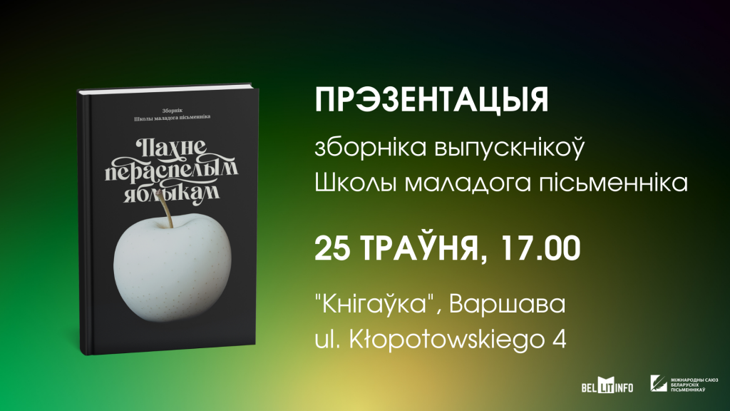 А ўжо 25 траўня ў 17:00 у кнігарні “Кнігаўка” ў Варшаве адбудзецца прэзентацыя зборніка “Пахне пераспелым яблыкам”. У сустрэчы возьмуць удзел аўтары і аўтаркі выдання, выкладчыкі Школы маладога пісьменніка.